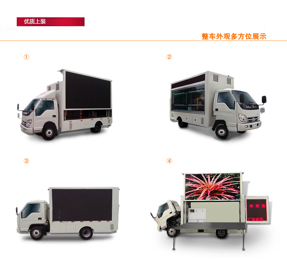 標準: 標配:主駕駛側(cè)為全戶外高清防水車載防震全彩屏,副駕駛側(cè)為數(shù)字滾軸燈箱外加鋼化玻璃,加單色條屏。5cm復合鋼架廂體,高檔木質(zhì)內(nèi)飾:廂體為圓弧形或者直角形鋼骨架結(jié)構(gòu),地板鋁花紋板、機電一體化控制、循環(huán)通風降溫裝置、安全智能內(nèi)外網(wǎng)配電切換系統(tǒng)、歐碼靜音柴油發(fā)電機組、千兆媒體控制系統(tǒng)、防震工控電腦一臺、功放一臺和防水音柱四臺。
